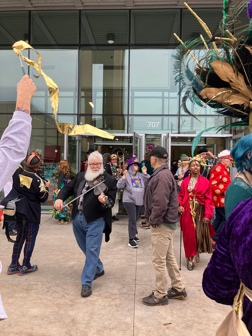 The moveable feast of the parade -- sporting dozens of be-glittered people playing all kinds of horns, drums, bells, kazoos, and washboards -- shimmied across Massachusetts Street, snaked into Terrabonne, a Cajun restaurant, then uncoiled out again. It was a clown car of seemingly infinite cheer and hope, dancing joyfully or walking with a rhythmic purpose, overflowing with colorful masks and purple and green streamers as well as hard-won spirit and sass.